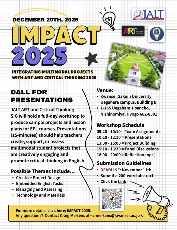 - Website and Flyer: https://sites.google.com/jalt.org/jaltartsig/events-news